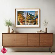 Wooden puzzle with 1000 pieces. Cities and countries. Rain in an autumn city