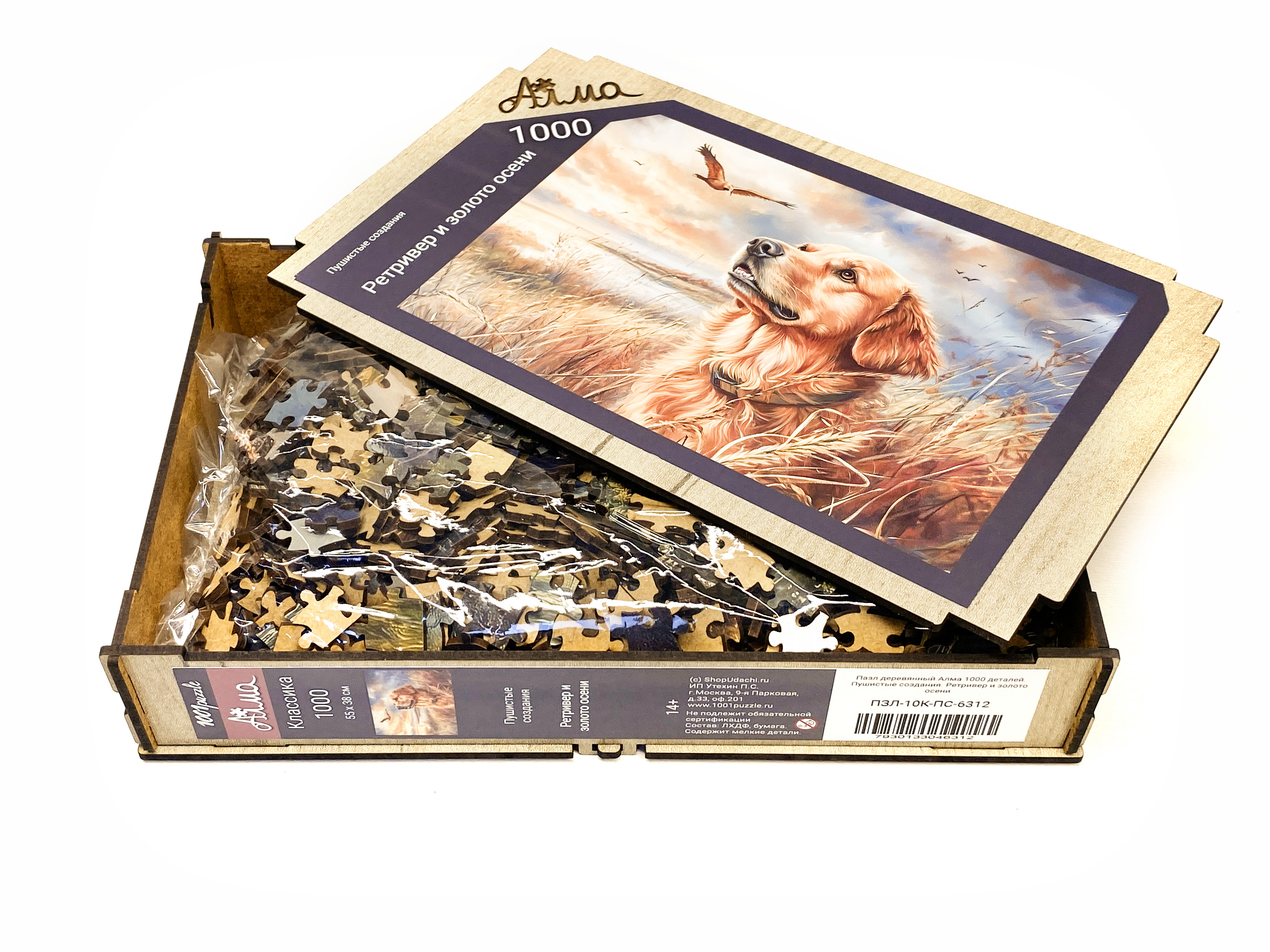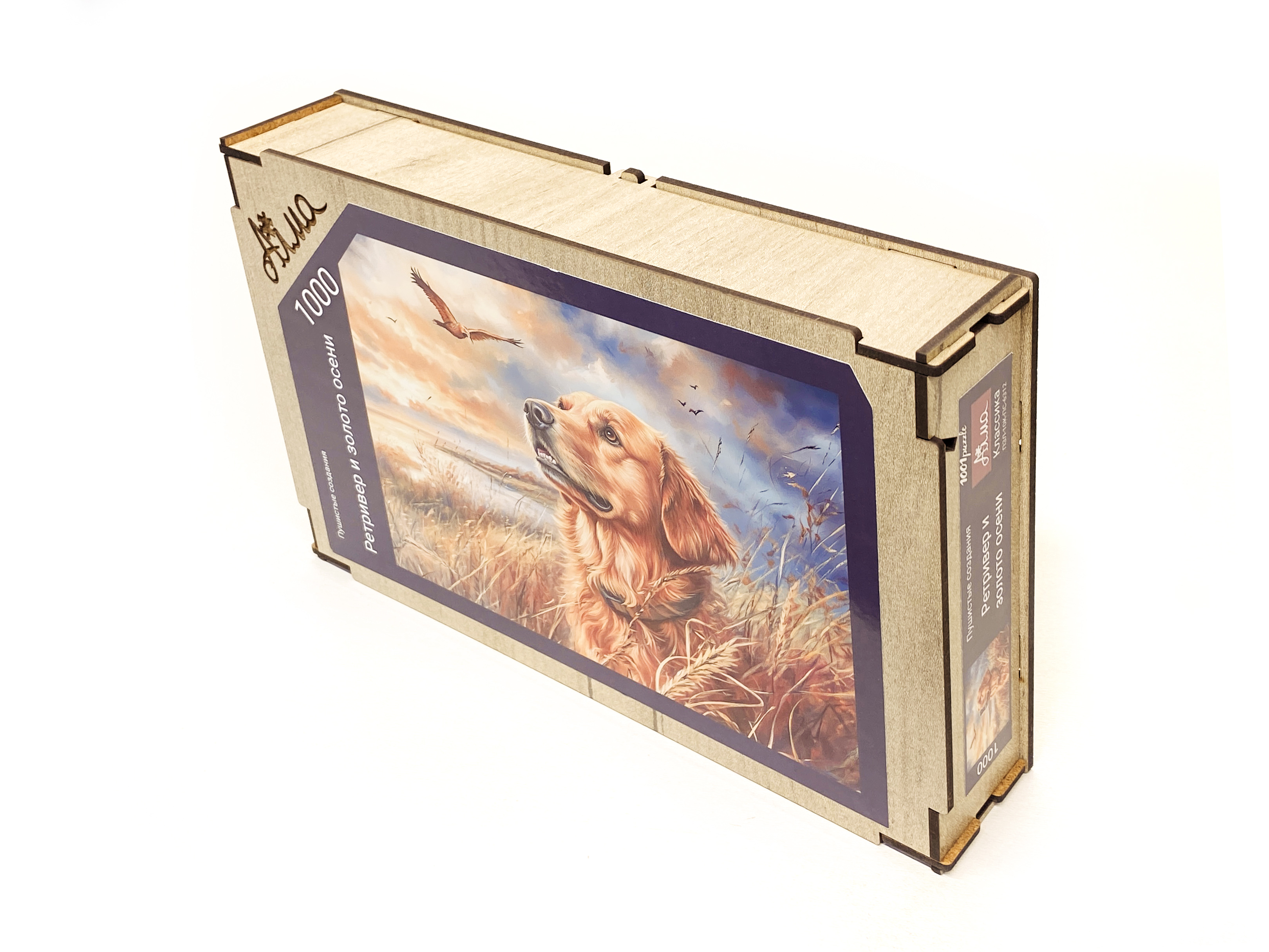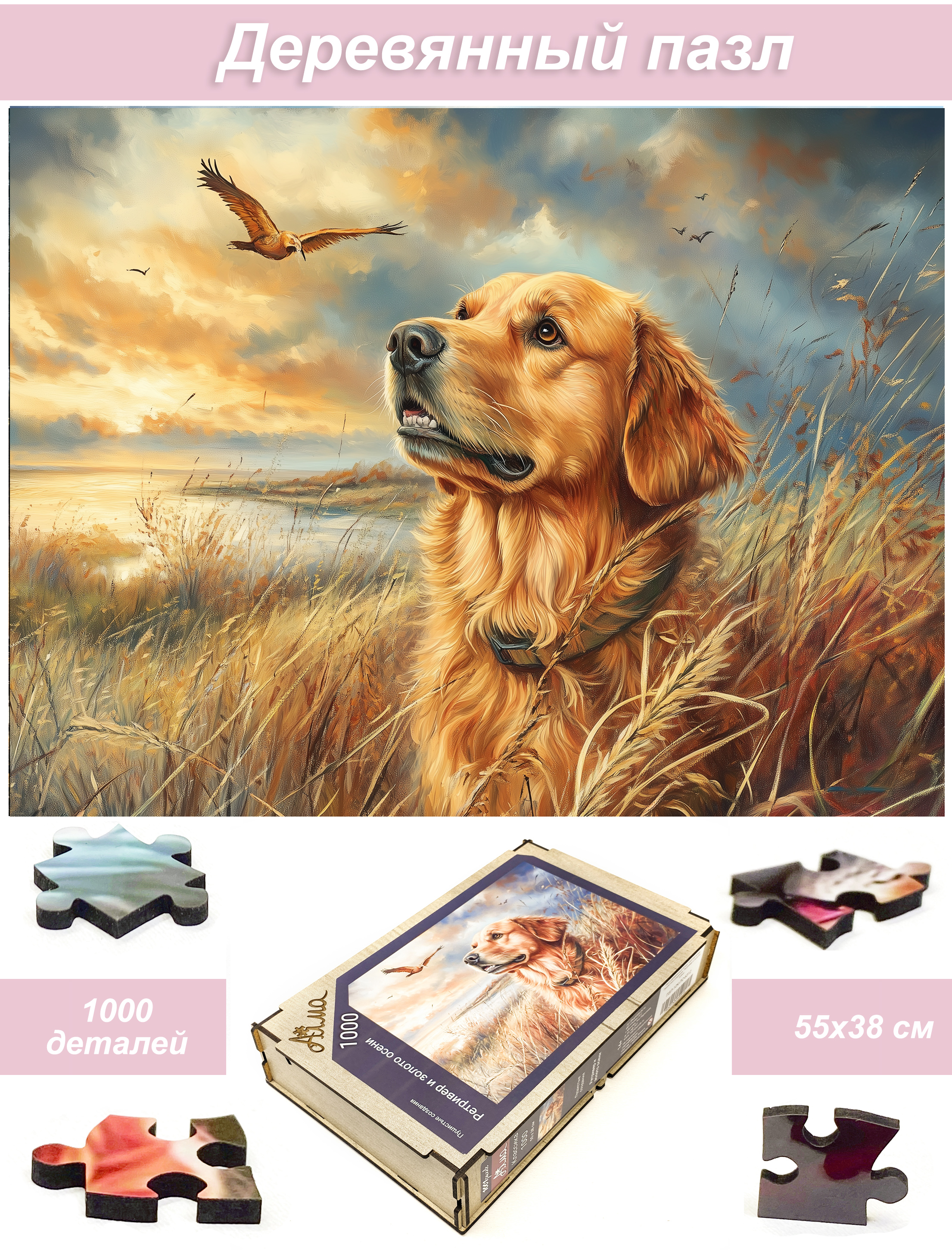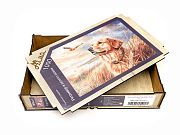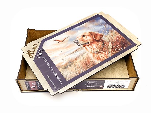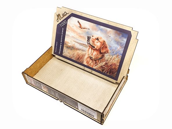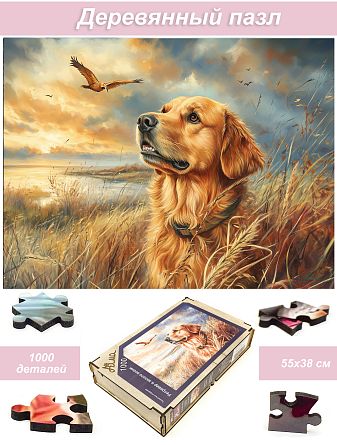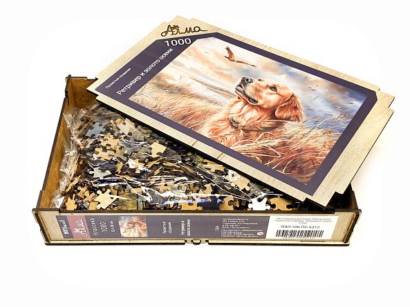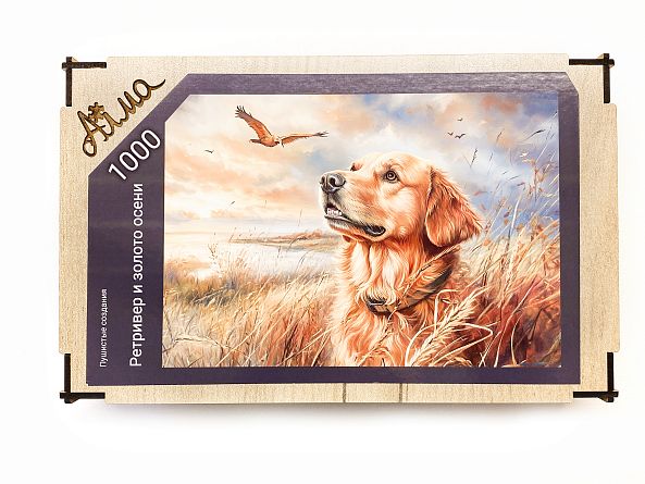 Wooden puzzle with 1000 pieces. Furry creatures. Retriever and autumn gold