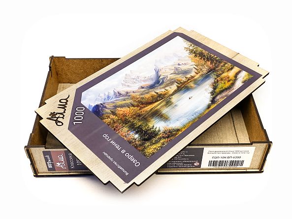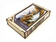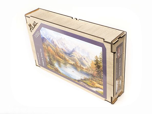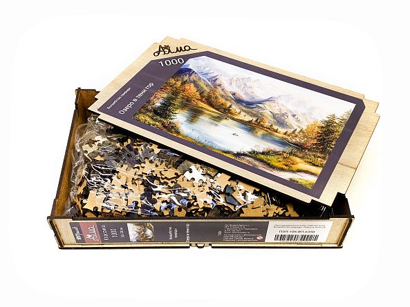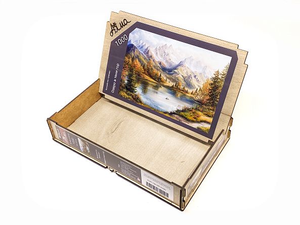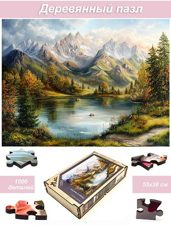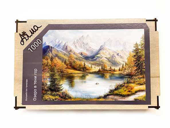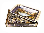 Wooden puzzle with 1000 pieces. The magic of nature. Lake in the shadow of the mountains