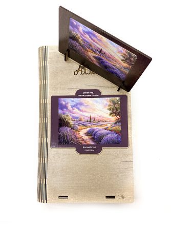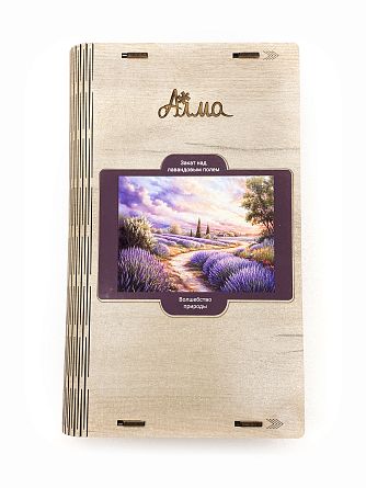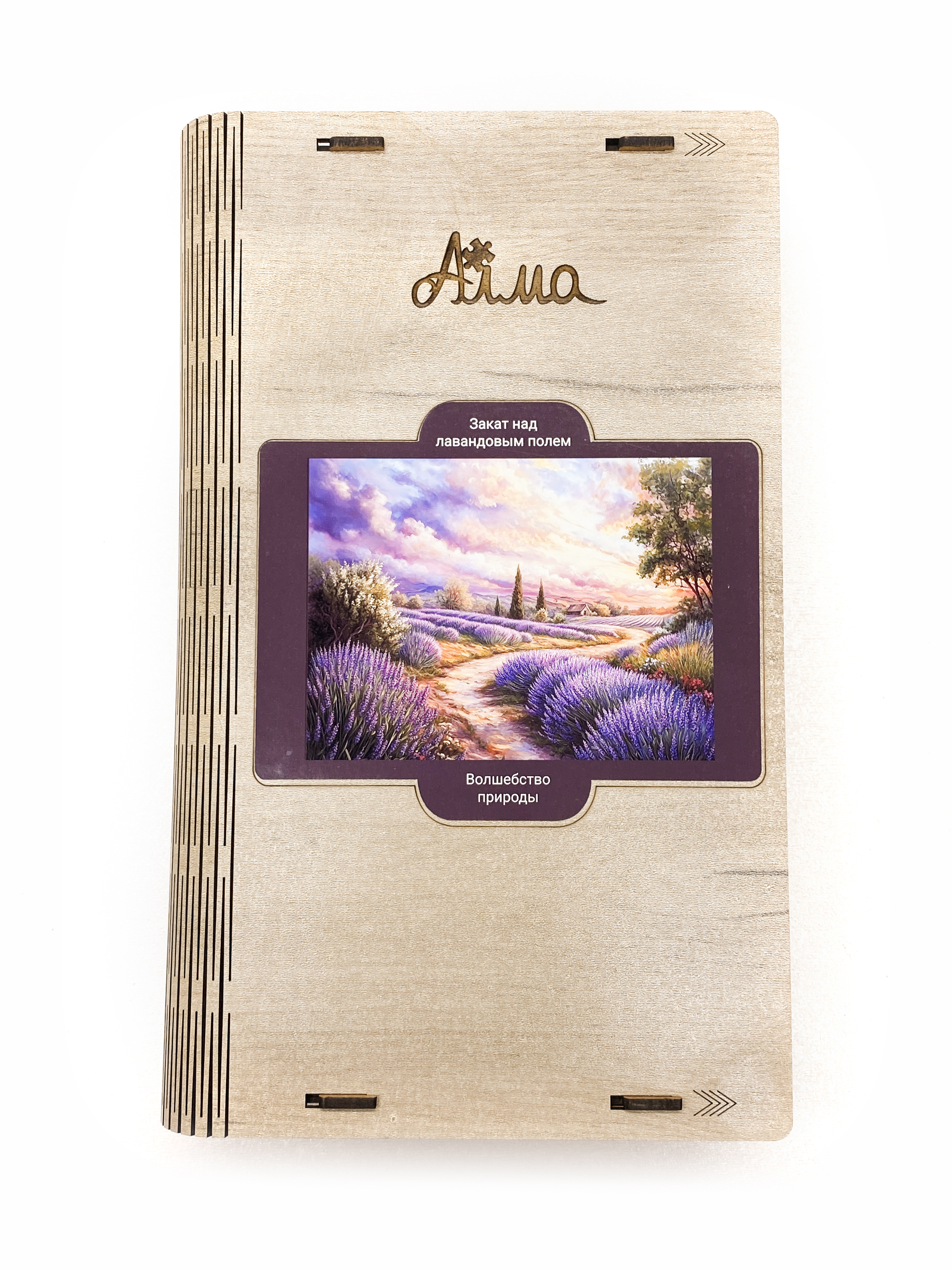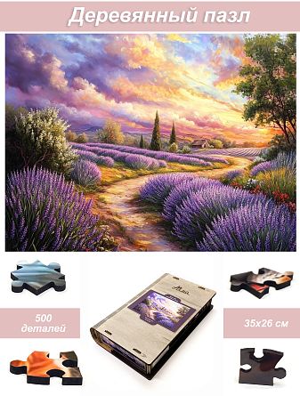 Wooden puzzle with 500 pieces. The magic of nature. Sunset over a lavender field